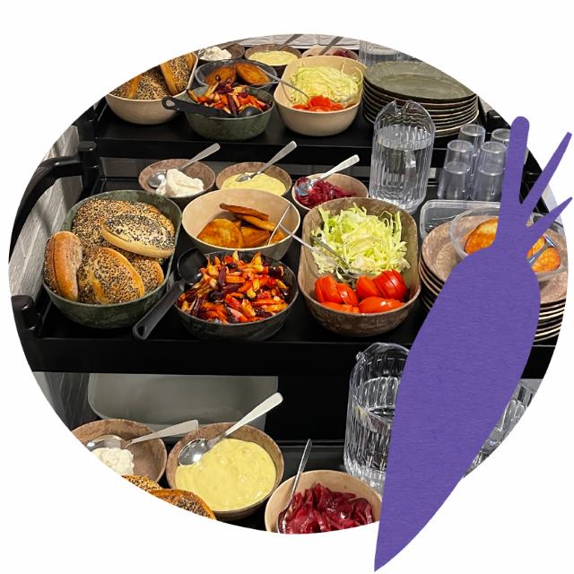 Maden serveres på den måde, der passer bedst til jeres skole – i kantine, klasselokale eller fællesrum. Der bruges ikke portionsbakker eller engangsemballage. Maden anrettes i fade og skåle og rulles ind på rulleborde, mens duften af mad spreder sig. Børnene øser selv